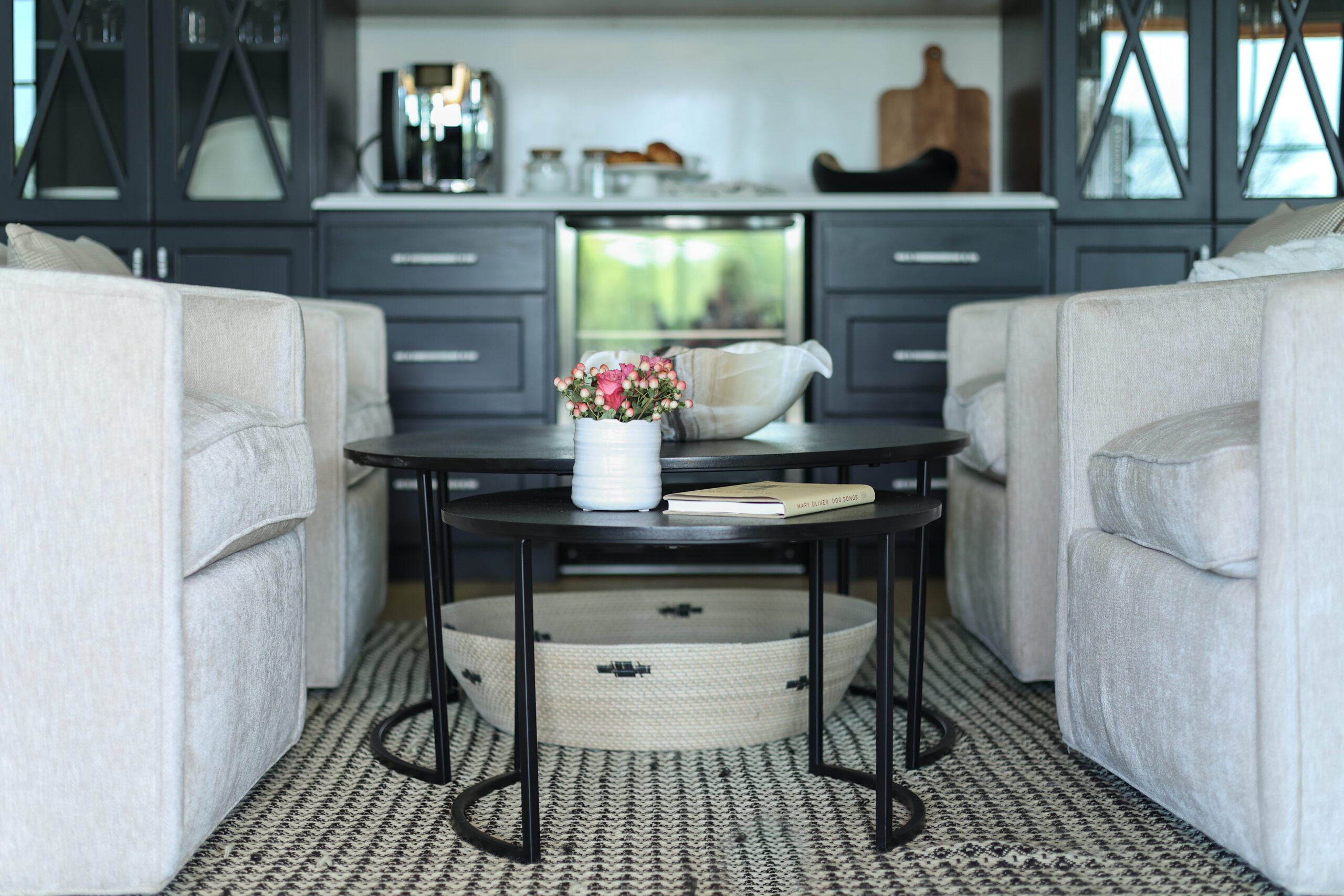 Our client typically favors black-and-white décor but wanted to introduce color in this home to create a joyful, inviting atmosphere. We found a one-of-a-kind rug at market, which set our design in motion. From there, we chose the sofas and introduced subtle colors and patterns throughout the home that would play off each other. Of course, we kept the background neutral to keep that familiar black-and-white element and to let the colors shine.