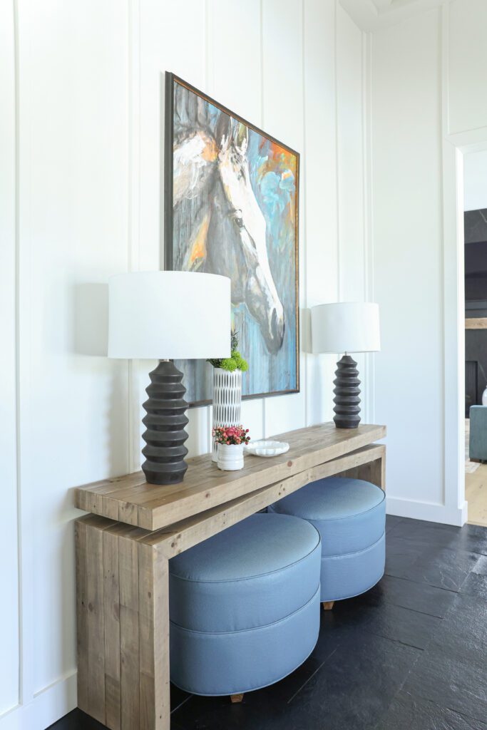 The home may be in the country, but we had to include all the modern amenities for comfort such as the remote controlled shades and black out curtains. Imagine waking up, pressing a button and seeing llamas and horses outside—such a dream!