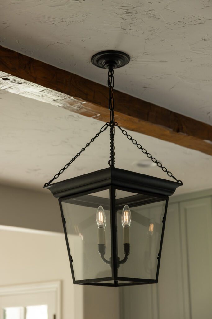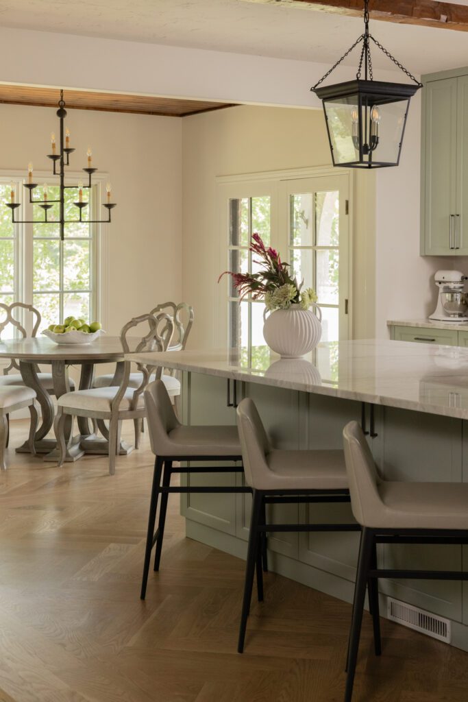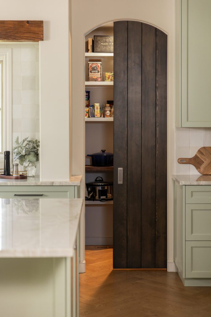 The new open layout features an oversized island—perfect for our client who loves to cook. For added storage, we extended the square feet of the kitchen by replacing an unused back entrance and hallway with a new walk-in pantry, complete with a custom arched pocket door.